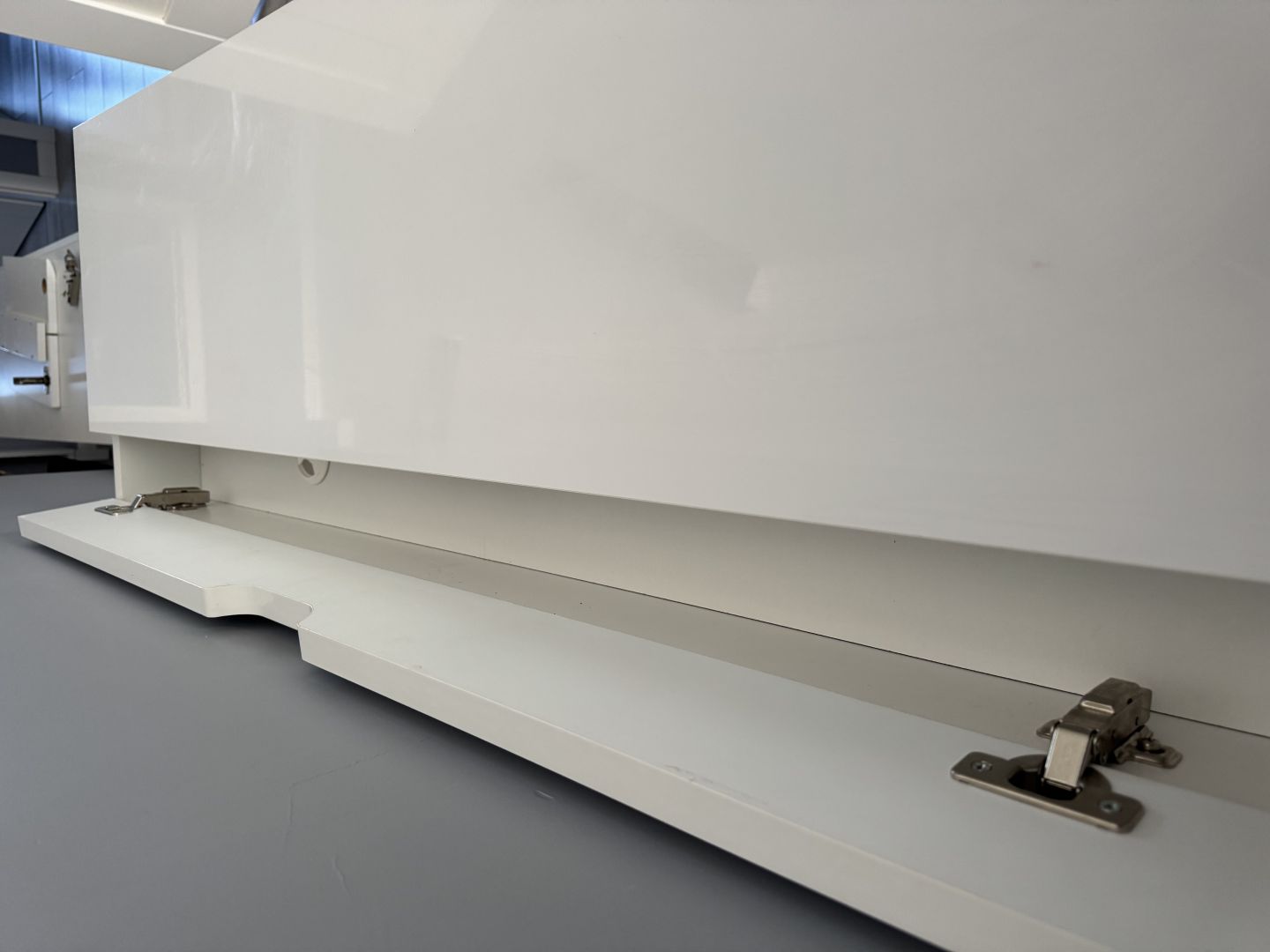 Nowoczesna, biała szafka RTV o wymiarach 152x45 cm i wysokości 49 cm. Posiada podświetlenie, dwie zamknięte szafki oraz otwartą półkę na sprzęt. Prosta...