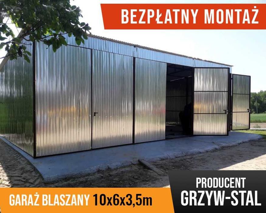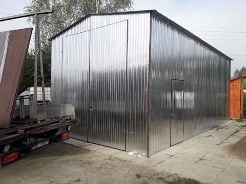 Garaż blaszany ocynkowany o wymiarach 10x6m z dachem ze spadkiem na tył.