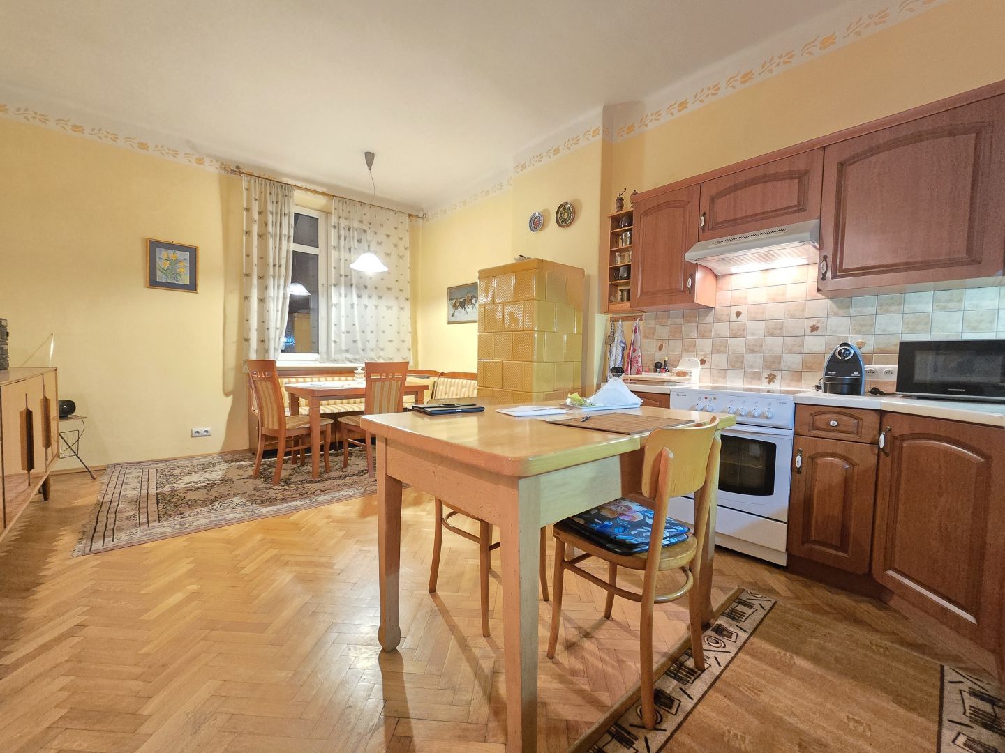 możliwość zakupu sąsiedniego mieszkania (ok 55 m²) – razem te 2 mieszkania tworzą całe piętro kamienicy