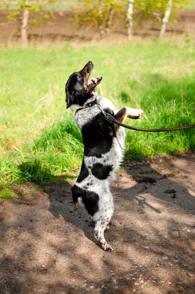 Nasza schroniskowa „krówka” dosłownie szaleje na widok podniesionego kija – staje na dwóch łapach, merda malutkim ogonkiem i czeka na zabawę. To sprawia mu ogromną radość!