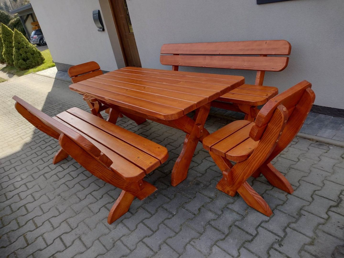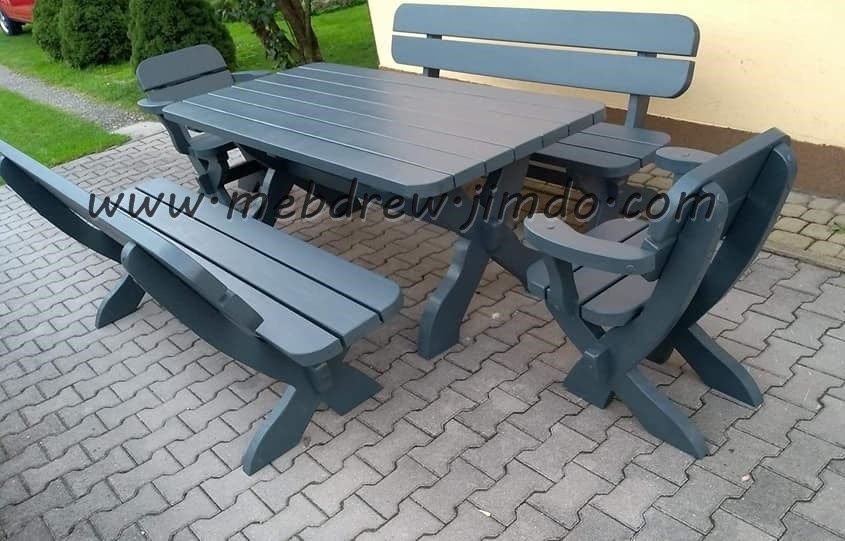 stół + 2 ławki +2 fotele z podłokietnikami lub bez.