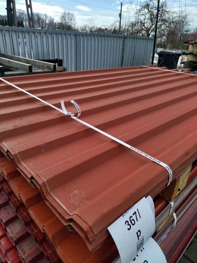 Na sprzedaż blacha trapezowa II gatunku (towar z wadami powłoki) — paczki po ok. 50 arkuszy, łączna powierzchnia pakietu ok. 114 m². Profil TBD-18 o szer...